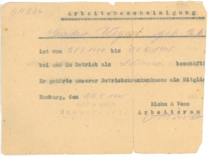(Abb. 5) Arbeitsbescheinigung über die Beschäftigung von Gustav Wegert als Schlosser von 1934 bis 1945 bei der Firma Blohm & Voss (Privatbild Familie Wegert).