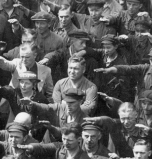(Abb. 1) Arbeiter der Hamburger Werft Blohm & Voss am 13.06.1936 beim Stapellauf des Segelschulschiffs „Horst Wessel“ - Nur einer verweigert den Hitler Gruß; sz-photo